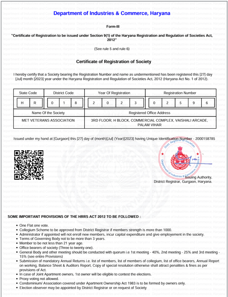Met Veterans Association is registered as a Society under Section 9(1) of the Haryana Registration and Regulation of Societies Act, 2012, with its Registered Office located at: